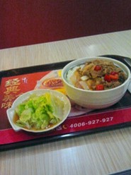 男朋友在附件上班 中午一起吃午饭 这次我点了香菇鸡肉套餐 搭配了排骨汤 和酸梅汁 香菇鸡肉很鲜美 滑滑的 鸡肉好嫩的 汤也很浓很好喝 里面很多排骨 很酥的 还有枸杞山药 呵呵 营养又美味 可惜量太少了 好大的茶碗 里面缺很小的碗 男朋友点了排骨套餐 也很美味 可惜他每次饭都不够 嘻嘻 希望已经能有加大份套餐 满足不同人的需求查看更多