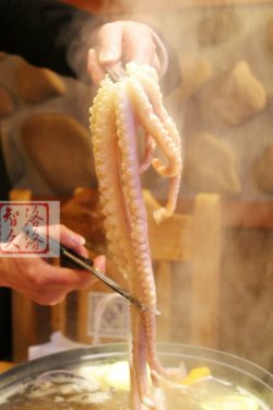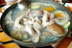 一到餐門口,就被其的裝潢風格所吸引,全木制的,很是別致喲~看的出甚為用心的裝潢~一步入店門,服務生就引座了~翻一翻菜肴,菜肴的品種還真是蠻豐富的~等等火鍋的時候,拍拍店內的環境~每一個包廂都有一個雅致的別名,諸如:蓮花,百合之類的,清新脫俗~稍等片刻,前菜小食端上桌,還有熱熱的大麥茶與小粥~掃去寒氣~甚為暖和~6種前菜小食,有泡菜,白蘿蔔,小魷魚,蛋餅皮等等~洛比較偏愛於蛋餅很好吃唉~很有韌性的口感~不一會兒,火鍋也來了~大大滴一個鍋內有N多的殼類,蛤蜊,小鮑魚等等~涮菜,有蔬菜大拼盤,手擀面一份,2只餛飩~牛肉片一份~開吃些火鍋內的蛤蜊,原汁原味的,湯很清澈~再蘸一些他們家特制的sauce配著wasabi~清清爽爽的口感~此時服務生GG拿著張牙舞爪的活的!!!大大滴章魚過來了~扔進鍋內~只見活章魚在鍋內扭動,甚為有趣~可謂是一大看點~服務生還貼心的把章魚一段一段的剪開,還囑咐要趕快吃喲,否則煮久了,吃口會有些老~別古吃第一塊章魚須的時候是最為美味的時刻,QQ的口感,實在是很有質感~章魚吃的差不多的時候,再開始涮牛肉面,蔬菜,麵條什麼的,放入韓國辣醬,甜甜的辣辣的很是開胃~他們家的手擀面很不錯,吃口十分的Q彈,久煮也不會糊掉~這頓晚宴絕對屬於視覺+味覺的雙重享受~噱頭十足的活章魚絕對搶鏡頭~店內的環境又幽靜~服務的態度周到~甚為滿意也~查看更多