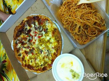 店面比较小,老板娘很热情,东西的口味不错,匹萨,底较薄,香脆可口,上面的食材也蛮多的,味道好。鸡茸蘑菇汤,口感不错。鸡翅,很入味,很好吃。意大利面,味道也很好,喜欢吃。还有香蕉派,苹果派,土豆泥,口味都蛮好。价格又便宜,很实惠,性价比非常高,值得推荐!店家主要还是外送,感觉蛮方便的。如果在附近上班的,换换口味,挺好的。