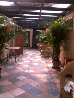 北新桥店从地铁的东南口出来往东约10米的地方面就是。招牌是很低调的暗绿色,走过很容易忽略。推开屋门里面别有洞天,小小的室内厅有两进,出去就是凉爽的院落,三三两两的座位散布院落的各角落,虽然室外阳光明媚,这里却绿荫青青,静谥、舒适、让人心情大好。院落两侧还有包间,点餐、叫人都只需通过呼叫器进行。顾客较多,服务员还是有些招呼不过来,点菜、上菜较快,加水等服务较慢。年轻人、老外居多,来的这天店里有员工聚餐,还要提前下班。这儿的餐品主打西式简餐,汉堡、披萨、意面、牛排套餐等等,人均100+,现在有代金券团购,相当于打85折,折后的性价比还不错。土豆沙拉:30米,土豆块很大,不是那么面,有点脆的口感,佐以洋葱碎,再加沙拉酱调的,酸甜适中,比较开胃。烤薯皮58米:这是公认的推荐菜品,确实名不虚传。薯皮上加了火腿丁、乳酪,咸香四溢,薯皮外的焦香酥脆,让人食欲大开。祖母家披萨95米:说是12寸的,上来后看大是很大,饼胚的厚度上较薄,奶酪也不多,拉丝的效果不明显,味道中规中距。包间里也只是给了瓶番茄酱佐餐,没有一般西餐厅里提供黑胡椒、芝士粉等吃披萨必备的调料。查看更多