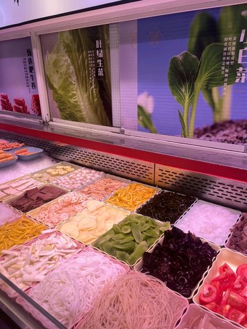 番茄豚骨湯鍋底 / 娃娃菜 / 蓮藕片 / 萵筍片 / 香菇 / 油豆腐