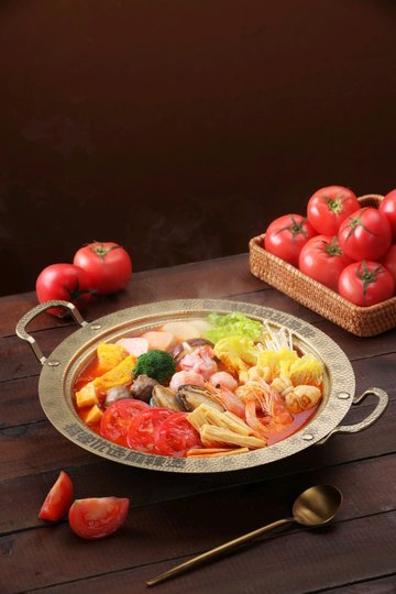 番茄豚骨湯鍋底 / 娃娃菜 / 蓮藕片 / 萵筍片 / 香菇 / 油豆腐