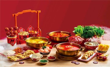 番茄豚骨湯鍋底 / 娃娃菜 / 蓮藕片 / 萵筍片 / 香菇 / 油豆腐
