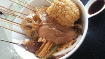 店面不是很大,但是收拾的干净温馨,桌子椅子也很干净,老板热情,看我们是第一次来,还会主动问我们口味。服务员很有眼力见儿,看到杯子里边还有半杯水都会主动给倒满。味道和麻辣烫差不多,就是是带签子的,卤肉锅盔看着和肉夹馍差不多,里边的汁水很多,肉也软糯可口,就是外边的饼皮比肉夹馍的要软一点儿。串里边的甜玉米很好吃,粒饱满,个头也大,蘸着麻酱吃口感层次特别丰富,其他的菜除了香菜太老之外都好吃,个人感觉也不用再蘸小料吃了,锅底的味道就足够,不会掩盖本身食材的味道,也不会感觉清汤寡水的没味儿。