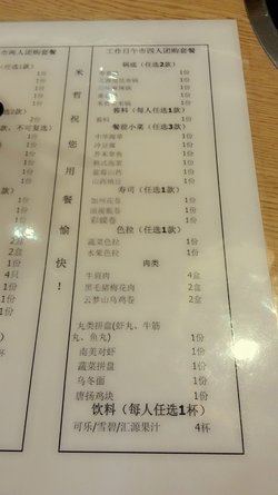 团购了仅售266元,价值316元双人日式自助火锅,双休日中午到的,如果不喝酒午市优惠活动一人128元,比团购还便宜,呜~~~选择了寿喜和米哲金锅双拼火锅汤底,各色肉类,虾,海鲜适量来了些,看到美美的寿司图片,真恨胃口小啊,不想浪费所以没有点,前菜的海草和芥茉章鱼味道也很正宗,蔬菜和饮料可以自助拿取,冰淇味道一般,其实香芋的奶香较浓郁些,最后甜品焦糖布丁很推荐,这边是半跪式服务,上菜挺快的,偶尔还是会漏单~~查看更多