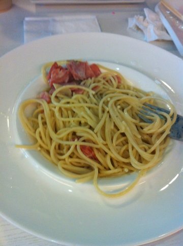 这家店位于国际时尚中心里面,貌似是里面唯一一家中档的饭店,生意超好,所以上菜的速度超级慢,估计等了半小时才吃到碗面。芝士培根意大利面:盘子很大,里面面的量一般,不算多,面的口感比较硬,感觉有点没有煮透,芝士奶香味挺浓郁的,培根是里面唯一的浇头,咸咸的,配上面条,味道还不错。珍珠奶茶:竟然是装在塑料杯子里的,像是在叫卖外,味道么真心不怎么样,很淡,即没有茶香,也没有奶香,略带点甜味,口感缺少了些丝滑,珍珠比较有弹性,就是量有点少。…Read More