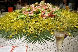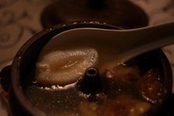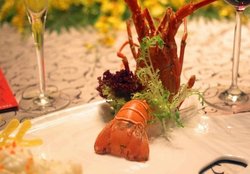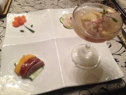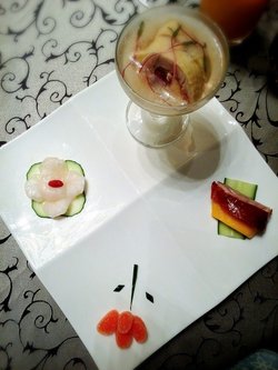 位于五星级的虹桥元一希尔顿酒店的粤轩,久闻其名踏入包间,就展现出他与一般性酒店的不同之处足矣容纳20人的圆桌,在如繁星般闪耀的灯光下,大气而充满暖意虽然是中式的菜肴 ,却走的是set的形式,更显精致,让宾客更觉尊耀精选前菜牡丹河虾仁,鸳鸯萝卜卷,冰镇黄酒鸡,香芒烧鸭脯,分别以不同的姿态摆放牡丹河虾仁,如一朵花般,叶片是黄瓜和虾仁,花蕊用枸杞镶嵌鸳鸯萝卜卷,爽脆的胡萝卜,很清口,造型是一支绽放的花冰镇黄酒鸡,放在一个杯子中,酒香扑鼻香芒烧鸭脯,鸭脯配上黄瓜,说是可以解油腻,但是我觉得鸭脯烧的正好,不油腻川贝海底椰炖黄儿汤上来是个小气锅,不知道是不是用这个烧的里料丰富,还有鸡肉,汤很鲜美白雪藏龙他们把里面的龙虾肉挑出,拌以蛋清所以口感上更感滑嫩,上面还撒上鱼子,佐以写着“粤”的酱料,而龙虾壳则保存完整看上去就很气势的一道菜烧汁煎澳洲和牛排是一种创新的做法吧,平时吃惯了热的牛排这个因为放在石板上面,所以肉感偏冷金华玉树蒸新斑片肉质细嫩,入口鲜香,处理的一点腥味也没有杞子松茸浸津白松茸在菜上面,感觉象支蝴蝶停着略带酸酸的味道,让我回想起在云南的日子黄金脆米富贵浓虾汤泰国的香米,炸炒的脆香倒入浓浓的虾汤,即使泡很久,香米还是很脆木瓜蔓越莓炖桃胶Q滑的桃胶,有点显甜,不过挖点木瓜入口就不显的甜了,养颜的圣品查看更多