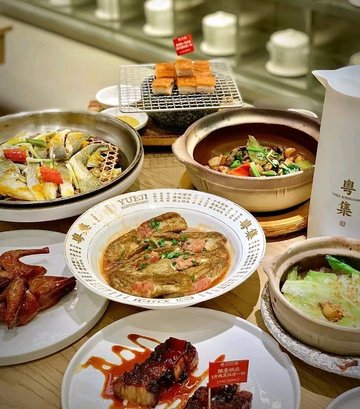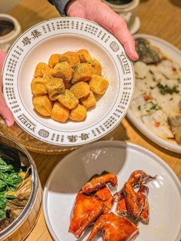 粵集現烤果木燒鵝下莊 / 海苔黄金一口酥豆腐 / 流沙鹹蛋黃焗南瓜 / 鮮花椒冬菜蒸鱸魚 / 菠蘿咕嚕肉 / 獨家脆皮黑叉燒