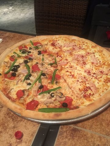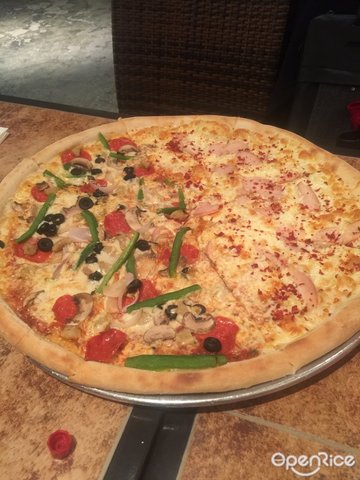 店的环境是不错的,位置选择的好的话,还可以边出披萨边看对面浦东的景致。美国很有名的真人秀节目地狱厨房,我是常常看的,么想到这里也有一款叫做地狱厨房的披萨。地狱厨房披萨上的配料,我觉得还是以蔬菜为主,饼皮上铺着很多芝士,所以吃在嘴里的时候,能吃出满口的芝士香,再加上蔬菜大部分都是以脆香为主,使得披萨吃起来更加的美味了。为了店员为什么叫做地狱披萨,和我的猜测一样,就是没有比它更好吃的了。他家的披萨可以选择一饼两味的。