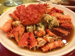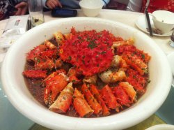绍兴饭店也算是沪上知名的老饭店了吧旗舰店坐落在上海马戏城的旁边分为上下2层同事的喜宴摆在这里 所以价格和菜单都没有看到来啥吃啥吧冷菜里 有一个听别人说是”八角“的特别的好吃长的像脱了水的黄瓜吃起来脆脆咸咸的但不是油炸的就像进口超市里买来的脱水蔬菜我很喜欢这个口味 吃多了也不口干热菜里 这个帝王蟹还是比较拉风的 一上来气势就很足 占据了整个台面的半壁江山我喜欢吃旁边围成一圈的蟹脚因为都被处理过了所以用嘴吸一头 蟹肉就乖乖出来了甜甜的 嫩嫩的 好吃吃的停不下来 很快就被消灭掉了个人喜欢这种烧法 比较的健康而且吃得出蟹的原味查看更多