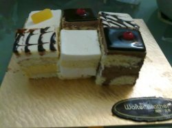 几年前某个活动中奖了他家的蛋糕了,是蛋糕切块,有貌似3种口味的,然后就打电话订购了,说明了是中奖的一张券。打电话时候一个小伙子接电话态度很好哦,问了详细的地址、电话等等很和蔼哦。这家没去过实体店,不过就在芍药居那边,不过这种蛋糕店一般都是电话订购的,也就不用去找了。订购了1天之后送来,接电话小伙子说没问题,之后第二天很准时的到了,给了他蛋糕券,他给了我蛋糕,送蛋糕的小伙子态度非常好,很和蔼的说话,并且友情提醒蛋糕吃不完放冰箱,如果要吃很长时间可以冷冻都可以的,还说了叉子、盘子都在里面了,吃的时候小心巧克力会弄身上。送走了小伙子就打开了,卖相摆放因为小伙子骑自行车来的,估计挺快的,所以盒子东倒西歪的,不过没关系蛋糕好吃就行,我又不是非要在乎那个样子好看不好看,人都不可貌相嘛,更何况蛋糕呢。蛋糕是6块儿,3种口味,巧克力的、黑白巧克力的和黄桃的。味道都很赞啊,我一种吃了一个,剩下给爸妈分了。黑白巧克力那个是白蛋糕上面有些巧克力酱。巧克力那个上面都是巧克力酱,很赞哦。黄桃的是白色奶油蛋糕,上面一块黄桃,也不错啊。查看更多