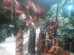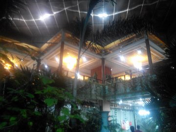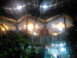 这家店在城市学院附近环境很有特色,像是一个热带植物园,里面有很多的热带植物新派全爆,里面有虾仁,鱿鱼等等,酱香的,味道不错,很鲜美清蒸多宝鱼,味道很新鲜,清蒸的做法保留了多宝鱼的汁水,原汁原味有很多的人在这里面办婚礼,经常会有大音响,稍微有些打扰正常吃饭的人群