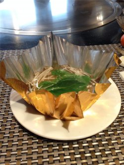 外面大堂硬件条件很出色,玻璃的屋顶,光线充足,但是小热。包间的环境不错,适合热爱安静的朋友。豉汁菱粉蒸扇贝,这道菜感觉一般,不是师傅烹饪的问题,主要是扇贝的食材不够新鲜,只有薄薄的两片,余下的都靠菱粉来填补,提鲜的主料量不够给力啊。阿拉斯加深海碟鱼头,这种深海鱼头配合剁椒在铁板上制作,虫虫还是第一次吃到,中国特色啊。相信无论是发明铁板烧的西班牙人,还是后来的日式铁板烧,法式铁板烧决计不会想到会有这种吃法吧,哈哈。小小滴一碟,鱼头中的胶质不错,剁椒的味道很重,掩盖了其他的味道。黑椒菲力牛排牛肉鲜嫩可口,就是很少。洛神花茶据说是店家自己熬制的,很浓郁。玫瑰茄的大名即为洛神花,起初还真有些不是周郎是周郎的味道。紫苏牛肉卷,每人一卷,这道菜其实是韩式烤肉的吃法,但是这样混搭也很出位,主要是里面的蟹子很爽脆,配合上紫苏特有的香味还不错。香肉丁爆海肠,这道菜由于加入了芥末,味道更为鲜美,海肠很脆口,师傅火候及口味的把握那是相当到位。蒜香田七苗,就是广告里的那个田七啦,清淡的口味,加上蒜蓉还好啦。鹅肝鱼子酱蒸蛋,这道菜品是铁板烧里面很见功力的一道菜,主要是看大厨对于火候的把握。最后加上鱼子,用勺子搅拌后味道更好,混合着鱼子及鹅肝的香味,调动味蕾啊,很给力查看更多