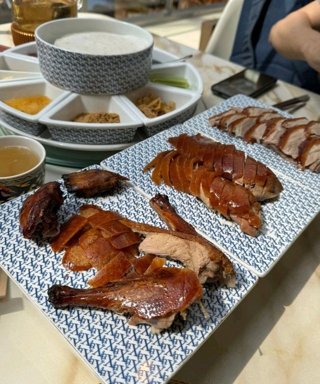 朋友帶路,預先搶咗特價優惠,第一次試食呢間出名嘅北京烤鴨。烤鴨都係由師傅喺你面前現場切片,佢會分成幾個部分,包括鴨胸皮、鴨胸肉同鴨腿肉。另外仲會上一個八寶盒,裏面有好多唔同醬汁同配料,當中比較特別嘅係一啲好似薯片嘅脆片同埋爆炸糖,原來呢啲配烤鴨都好好食,可以增加唔同口感同風味。講返啲鴨,鴨胸皮好鬆化但又唔太油,鴨肉都好入味,加上唔同配料造成嘅配搭,食好多件都唔會覺得單調。另外飲咗鴨湯,清清地唔會好油可以解膩。食完隻鴨已經好飽,臨尾加多一客驢打滾做結尾,佢唔會太甜質地又好煙韌,非常好食。…查看更多