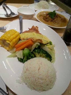 又来吃翠华了,两个人点了咖喱牛腩配烤饼,芙蓉凉瓜,叉烧和水芥菜。咖喱牛腩配烤饼,58元,量不大,不过牛腩炖得很酥烂,烤饼新鲜出炉,层层酥脆,蘸着咖喱酱吃,老灵的。叉烧,例份48元,我觉得烤得不是很入味。芙蓉凉瓜,36元,挺家常的,苦瓜处理得蛮好的,不觉得苦。蒜子上汤水东芥菜,36元,这个挺好吃哦,上汤味道很鲜,水东芥菜脆脆的,很清爽。饮料点了冻鸳鸯和薏米水,随便喝喝啦。点单的服务员是新手,菜式不是特别熟,但态度还是挺不错的。