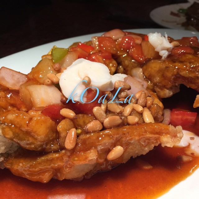 虽说他们家的确是有挺多不错的菜品,不过烤乳猪真的是过于一般了。从味道上来说过于咸了,空口吃不能接受,乳猪比较瘦,基本上没见着啥肥肉,下面垫底的也全是瘦肉部分。乳猪皮烤过头了,很硬,缺少了些脆脆的口感,但又不是每块都很硬,有些还算一半硬一半脆,明显烤得不均匀,只能给三星。