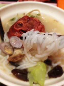 礼拜天,到表姐这里和表姐聊天,然后带外甥去学围棋。然后无聊就和表姐在金桥国际4楼的老妈米线吃东西。表姐点了一个双椒鱼头。还有童子鸡米线。等鱼头上桌以后大吃一惊,好大的鱼头啊。上面放满了双色的辣椒,香味扑鼻。我忍不住了,就首先动了筷子,哇塞,又香又嫩的鱼肉配着辣味的汤水,唇齿留香,果然不凡。再看童子鸡米线,和过桥米线一样,把那些吃的配料入肉皮,青菜等放入童子鸡的小砂锅里,最后放米线。稍等片刻就可以吃了。鸡汤的香味很浓郁,非常的好吃。米线也很美味,鸡汤味都吸进去了还有那鲜嫩的童子鸡。真棒!查看更多