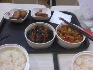 火车站旁边随便吃吃的,点了两份鸡翅,一碗宫保鸡丁饭,一碗老鸭蘑菇饭吧,名字有可能不准确哦。鸡翅做的还OK,就是普通的烤烤,良心话不如肯德基的新奥尔良烤翅,宫保鸡丁饭鸡肉非常的少,味道也不好,怪怪的,老鸭蘑菇还OK了,饭也不多,有吃不饱的危险。…查看更多