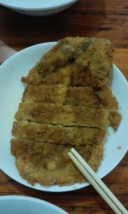 晚上特地骑自行车过来吃的,也不想吃特别容易饱的主食了,直接吃了炸猪排,运气不错的吃到了超大的一块哦,价格是便宜呀,油炸的刚好,油腻感几乎为零,吃起来注意力完全集中在猪排的香脆外皮上面,肉感很厚实,下方还有酱油哦,所以吃起来咸香感也是棒棒的。查看更多