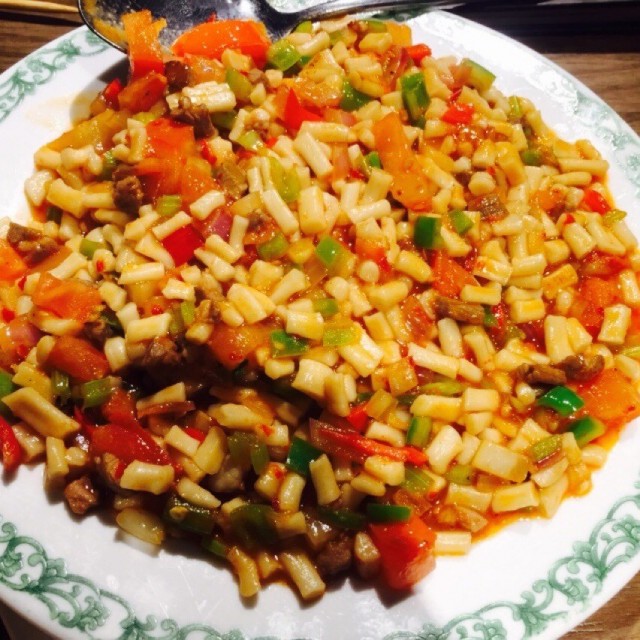 因为有朋友是新疆人,不吃猪肉,所以每次聚会只能到新疆的饭店了。必点的是大盘鸡,很好吃,不仅味道到位,而且量也很多,特别喜欢里面的土豆很嫩很酥,而鸡肉是很嫩很入味。其次是竹签羊肉串,里面的羊肉是肥瘦适中,烤去油肉很香,而且原汁原味,就是每一串的量太少了,自己不吃上三串完全不过隐。吃饭的过程当中也很享受,可以一直看到有帅哥美女跳舞蹈。