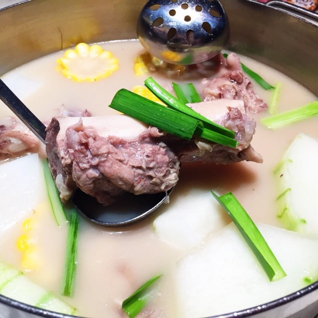 店名比较拗口,环境还不错。点了个小煲的猪骨煲,有胡椒,在阴雨的上海,这一顿真是很暖胃,分量超级足!没有腥味儿,上来汤滚就连喝三碗!另点了了茼蒿、日本豆腐、土豆、腰片、莴笋片,分量都很足,加点的八味豆腐,外层应该是裹了吉士粉炸的,沾辣酱油还蛮好吃的,虽然不晓得八味体现在哪里。环境也很不错,宽敞明亮,餐具也有特色;