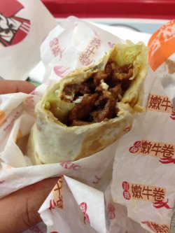 这家肯德基位于东城区前门大街88号,中午去的时候人还是挺多的,排了好长时间的队才买到。要了个嫩牛卷,里面是牛肉片,味道感觉一般,而且个头比较小,吃完感觉不是很饱的样子,还得来点别的。没有汉堡划算,而且味道还没有汉堡香,下次还是乖乖的点汉堡套餐吧~查看更多