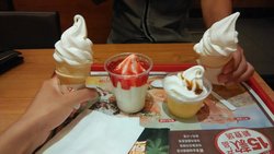 肯德基南湖东园201号中福百货一层, 望京和朋友在这里歇息。我们吃的冰淇淋。我吃的是甜筒和一个草莓味的冰淇淋。甜筒还是一如既往的好吃,奶很香浓,下面的脆筒嘎吱嘎吱的好好吃。好吃不贵就是这个。