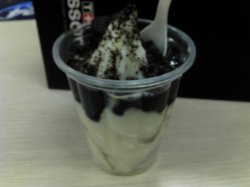 在重庆,谁要是让我夏天不吃冰,不狂吃冰,我想我会热死掉!我又去肯德基了,叫的第二杯半价的圣代,巧克力奥利奥味儿的,里面加了两块非常小的奥利奥饼干,很有趣的样子。相比上面的酱,我还是更喜下面的冰淇淋,夏天多吃冰淇淋,心情都会变好!