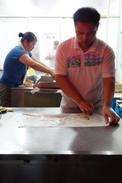 逛彭浦夜市小吃一条街不能错过的一家店,在别的摊位人还稀稀拉拉的时候,这家店就已经开始排队了飞饼的品种很多,他家最有名的是榴莲飞饼,但是因为本吃货不吃榴莲,所以就尝试了人气也很高的培根鸡蛋飞饼在做飞饼之前,老板都会问一声吃不吃葱,貌似有很多人都不要葱的,这点很人性化估计是熟能生巧,做飞饼的师傅手脚麻利,一个做饼皮,一个配馅儿,一个最后整合,全部切好装在盒子里他家还有专门自己的外带盒子,很是专业热乎乎先做的飞饼味道真的很不错,饼皮酥脆,内陷儿培根烤的很香,并且可以自己加不同的蘸酱配着吃,赞~~~查看更多