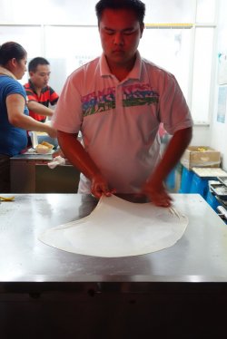 周五下班的时候和同事约好去吃的,他们家的飞饼真的是很有名,很多人都是慕名来排上个把小时的队伍才能买到。飞饼的种类多种多样,香蕉飞饼,榴莲飞饼,菠萝飞饼,还有培根鸡蛋口味的,种类多的让人挑花眼,都会有选择综合症了。我是选择了很大众的一种,香蕉飞饼,价格不贵,10元一份,就是等待的时间有点久。不过还好我们可以看到飞饼制作的全过程,师傅将一块饼皮抛的很高,可以做的足够薄,丝毫没有破损,然后铺上香蕉薄片,3分钟不到就可以完成,手艺真的是很高超!等拿到热气腾腾的飞饼,一定要趁热吃,饼皮很酥脆,香蕉的甜度刚刚好,一块飞饼切开的分量也很多,足够1-2个人的量,味道算是一绝,难怪那么多人喜欢吃他们家的飞饼,值得推荐!查看更多