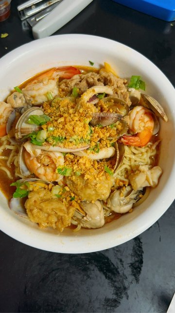 招牌海鲜猪杂汤米粉:虾肉弹牙,有鱿鱼,沙蚬,生蚝。汤水甜量大挺大的,料也给的很足,一碗下去也是饱饱的。