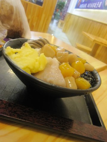 芋美人甜品店,和那些鲜芋仙什么的好像,感觉都差不多,价格不便宜,18元一碗,不过量挺大的,够两个人吃了这家的芋头感觉挺好吃的,很糯,甜甜的,很粉的,貌似比普通的芋艿好吃,应该是打成泥后又从新定型的,甜甜糯糯,冰冰凉凉,夏天吃了很清爽