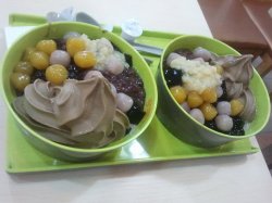 这家芋贵人甜品店,有一个特色的芒果系列。我点了他家芒果系列中比较人气的芒果2号。白色的花朵形状的广口碗里,先是铺着一层碎冰,然后上面依次铺着白玉圆、薏米仁、椰丝和芒果冰激凌。这是食材上面浇着的炼乳,让它们变得甜蜜可口,冰激凌里芒果的味道很浓郁,但是冰激凌冰凉的口感却有些降低了芒果的味道。食材里面,还是白玉圆的味道最后,Q弹糯滑的。查看更多