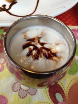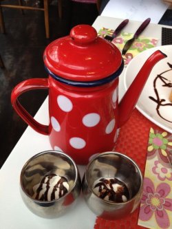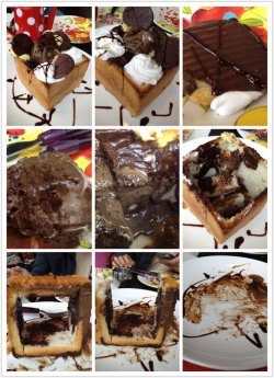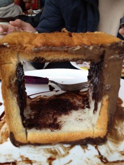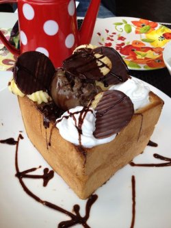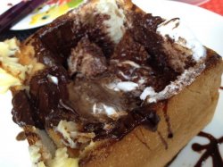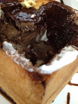 第一次团购这么远的地方就是为了这个巧克力大吐司真心远啊害我跑错地方巧克力大吐司真心嗲,里面的巧克力酱暴多,上面的巧克力薯片可能是薯愿的,以后在家里可以试试看做巧克力薯片,吐司烤得外脆里软,里面的面包很好的吸收了巧克力酱和冰激凌的汁水,冰激凌品质不大好,有冰渣,不过巧克力味挺浓的,上面4托奶油我也老喜欢的不能吃甜食的同学还是不要尝试这款吐司了,老公就说一点也不好吃巧克力拉茶,奶茶加了两坨奶油果然变好吃了金枪鱼色拉,单点的,败笔啊,金枪鱼哈腥气,量也很少,还是三文鱼色拉好吃啊,可惜他家没有他家餐具很有爱,环境也不错,就是地方小了一点wifi也很给力,非常适合下午茶查看更多