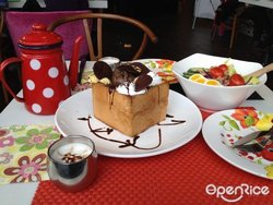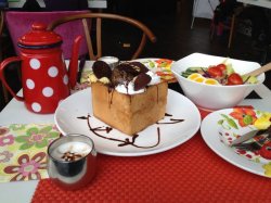 这家店的环境很喜欢,有点小资,但是不是很高调张扬,大大的沙发座上放着舒服的靠垫和抱枕,想来老板是一个很贴心的人。店里做的是西式简餐,有牛排、肉酱面和各种甜品,当然甜品就是他们家的特色,所以我一般会约上几个朋友去他们家喝喝下午茶。甜品真的蛮多的,各种吐司、巧克力蛋糕、奶冻、提拉米苏,外形看上去就像他们家的装修一样,精致中透着一股大气。最爱的就是巧克力大土司吐司,有点类似茶餐厅里面的厚多士,上面是满满的巧克力酱,下面的面包烤的很脆,一个量也超大的。查看更多