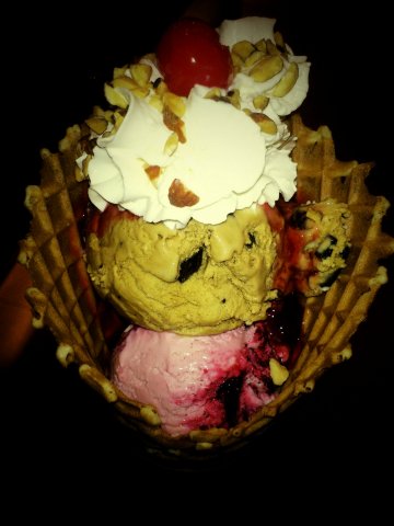 晚上八九点了大概,吃完饭去的。虽然没人了但还有两个小姑娘值班。附近交通特偏僻,下了公车走了好久才到这块的。之后打车也打了十几块才到地铁站的。点了两个球,光看颜色来点的。因为各种眼花缭乱,口味和球根本对不上。第一个好像是什么摩卡的,还能吃到巧克力豆。第二个是树莓蓝莓什么的,介于个人口味不是很喜欢。太甜了,很快就腻了,鲜奶油都比两个球好。吃得都齁着了。觉得只有华夫筒是值的。下次还是试别人推荐的薄荷巧克力和棉花糖吧。觉得还不如哈根达斯口味大众。