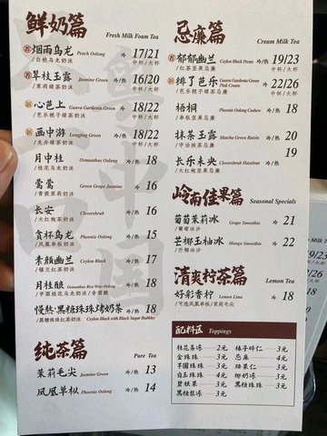 煙雨烏龍 / 貪杯烏龍 / 芋圓茶乳 / 龍井香檸茶 / 鳳凰單樅 / 荔夏冰冰茶