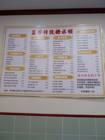 🚇交通:地鐵11號線南山站G出口,步行5分鐘。🏠環境:舊式廣東風格的裝修,室內面積不大,木枱配藍色膠椅,有點廉價感,中間天花掛有牌匾,整體明亮簡單。🤵🏻服務:QR Code下單。糖水:採用新鮮農場水牛奶及一級黃冰糖製作,均價十幾元左右,每一碗用料都超級紮實。🌿豆花芋圓斑斕凍(冷) ¥23☺️綠色的斑斕奶凍大件,Q彈滑身,三色芋圓入口軟韌,再配搭豆花底,🥰整體色彩豐富,味道亦有層次😋。🥭多芒小丸子(冷) ¥20🤩多料到滿瀉,賣相吸引,芒果大粒清甜😋,粒粒丸子煙韌,很棒!🥭芒果拌雙皮奶(冷) ¥18芒果粒大件舖面,雙皮奶一樣有水準!🫘紅豆雙皮奶(熱) ¥12上層紅豆蓉很甜,也舖得較厚,底層雙皮奶很滑,奶味濃郁🥰!🥭楊枝甘露(冷) ¥18🤩同樣多到滿瀉,有🥭芒果、西柚、🥥椰奶,不但奶味十足,還能吃到很多大芒果粒,入口很滿足🤤,更加入新鮮紅柚,很清甜。…查看更多