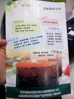 很幸运被抽到了试吃活动,快过年了,再不去就都放假了~还有,我添加了这家店,结果不是第一个点评,有些郁闷了。这家的地址是天府广场负一层(西御街6号),我最怕这样的地址了,因为一到纵横交错的地下,我必然迷失方向,再说,如果写上“地铁内”,我觉得还好一些,否则,我可能从地一大道的通道往下走了。好在把点评翻出来看了一下,原来有疑虑的不止我一个人,看了扁扁的点评,对地方有了些感觉,应该是从天府广场的地铁入口下去一层,千万不要到第二层了,因为那是地铁区域了。接下来再找潮汇,好在我晓得西御街大致是哪个方向,没有去绕一圈,也不难找到,我去的时候可能是工作时间,负一层生意都很清淡,这家也是,我说了我是点评网的,店员态度非常好,还一再致歉说周末的时候人太多,好多货都销完了,我也很理解,好在是工作日,各种齐全~哈哈!可惜这只是个门店,卖寿司,没有地方让你坐着吃。看得出来店长是用了心的,因为除了寿司,还有其他食品,可以满足顾客的需要。品种有十几种,主要是三文鱼、章鱼、海藻、泡菜、鱼籽、鱿鱼等,价格不等,3-5元一个,感觉也不是好贵,而且这里的寿司偏韩式,从品种和之后的口感就可以看出来,底下的饭团味道比较清淡,但是很糯,跟日式的有区别,另外,面上的料也比我以前吃的日式淡一些,当然,掌柜给了不少酱油和芥茉,我先没有用,想尝尝本味,不过也还可以啦,首先是新鲜味,这点我认可。正常的话,人均吃一顿大概在20元左右,不过这里在搞团购,也很划算。