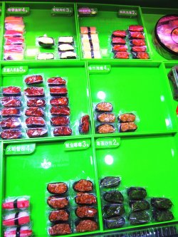 因为朋友很喜欢吃寿司,在春熙路这边转了哈~~刚好看到团购~~就团了一张卷,本来说想团两张卷的~~但是朋友说下午不饿,就只团了一张,就在天府广场这家去兑换的~~服务员用袋子~~给我们打包带走了~~~提着相当方便~~不要芥末~~店员给了很多酱油包~~服务态度也相当好~~品种也挺多的,价格便宜~~套餐如下:-寿司:三文鱼寿司(1份,价值5元),三文鱼很好吃,价格也便宜,就是块头有点小了~~~毕竟便宜~~所以块头太小了鳗鱼寿司(1份,价值5元) ,鳗鱼寿司依旧是我喜欢的寿司~~不错带子裙边寿司(1份,价值4元) 还算不错鲱鱼子寿司(1份,价值4元) 也不错,包着酱油一起吃还不错鱿鱼嘟嘟寿司(1份,价值3元) 价格很便宜,这个价真心的便宜松软肉松寿司(1份,价值3元)还算可以日式大根寿司(1份,价值1元),不错。~~~~~~~~~~~~~~~~~~~~~~~~~~还有以下菜品:爽口小章鱼(3元/份)鱿鱼嘟嘟(3元/份)鲱鱼籽(4元/份)希零鱼籽(4元/份)芥末章鱼(4元/份)味付海螺(4元/份)大崎蟹柳(4元/份)鱼翅海蜇(4元/份)美味贝裙(4元/份)龙虾沙拉(4元/份)带子裙边(4元/份)三文鱼(5元/份)烟熏三文鱼(5元/份)金枪鱼(5元/份)烤鳗鱼(5元/份)北极甜虾(5元/份)芝麻八爪鱼(5元/份)明太子沙拉(5元/份)海藻 (2元/份)泡菜 (2元/份)