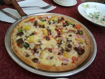 团购去的,性价比还多高的,不过要是正常价格去,看了下菜单,应该小贵吧,位置有点不好找,老外很多,看样子应该还是比较正宗的简餐,还有很多外卖食品和做面包这些的材料哦。 因为小赵同学已经吃过一回了,她说那个牛肉是水煮的,一下就失了兴致,然后在可选的套餐里面就选了PIZZA,结果上来把我们仨儿都吓傻了眼,这个份量,这个尺寸,太多了吧。上菜上得有点慢,害我们在纠结的时候又点了个意面,事实证明,最后我们打包了的。 提拉米苏,不错,不过我也没吃出来比其他家的优势在哪儿,原谅我这张吃甜品都差不多的嘴。蔬菜沙拉,很喜欢凯撒酱,有点微咸的味道配沙拉最合适了。奶油蘑菇汤,灰常好喝,以前吃这些都觉得腻腻的,莫非现在当了孕妇改口味啦,反正我一个人喝了一碗左右。至尊披萨,饼烤的很脆很好吃,就是太多了根本吃不了,我基本上吃了一牙就饱了。意大利肉酱面,坑爹,比那个意大利面+酱贵了6块钱,上来依然没看出来肉在哪儿,就是烂肉渣渣让我们看一眼也好嘛,味道只有蕃茄酱的味道,太单一了,我不喜欢,不过配的那个面包还是很好吃的。…查看更多