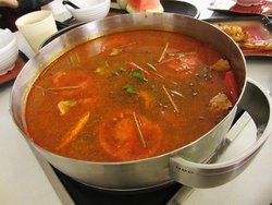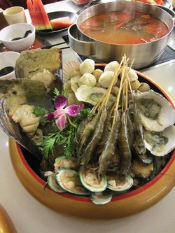 这家泰式海鲜火锅有个好听的名字——莲裳房子在财富又一城4楼。店面还算装修的不错。门口有只黑色的大马....这是神马风格?进门就看到自助区了,水果有西瓜等,还有银耳粥蛋炒饭狼牙土豆这些。 蘸碟也是自助的,我没有选择泰式的蘸碟,选了店家推荐的自己制作的特色蘸碟。锅底当然就是冬荫功啦,鲜辣冲鼻,泰式的锅底煮海鲜就是好吃。 虾子烫几下就好了,肉质不错。其余的海鲜也都中规中矩。素菜拼盘里面的萝卜还是心形的,蛮有心意的。PS:九肚鱼第一次吃哟!不过好好吃!煮出来肉质像果冻一样细嫩!小吃推荐炸的虾虾哦!好好吃哦!外面的千丝好酥!整体来说还不错,价格很实惠。2人的A餐168. 2-3人B餐228!在成都的泰式火锅里面算性价比不错的了。…查看更多
