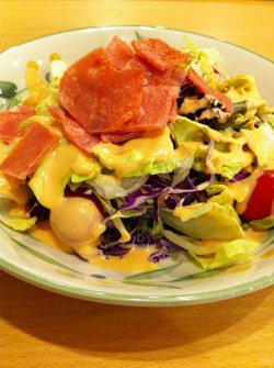 飞洲国际楼下有很多餐饮服务,吃过很多,还是萨莉亚性价比高,饮料畅饮又有好多品种,真是喝到爽。三文鱼沙拉,三文鱼带有一点烟熏的香,肉熏过后有点干,肉质紧实点,味道香而略咸,有点嚼劲,拌上沙拉酱,别有一番滋味,价钱还是不贵,可以多点不同的好吃的查看更多