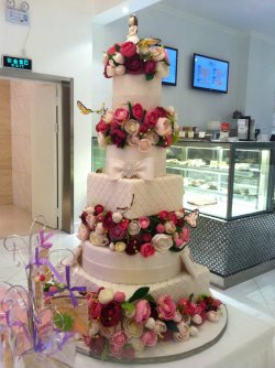 店面是白色为主的色调。大大的紫色沙发座,还有大的软靠椅。坐里面就陷下去,很舒服。配白色带波纹的桌子,上面是漂亮的吊灯,带有一些洛可可风格。进门的左手边是个三层的结婚蛋糕,点缀着玫瑰,很喜庆。中间是礼盒展示。它家主要做婚礼蛋糕的,样式不是很多。一边墙壁的格子中陈列着一些翻糖蛋糕,价格都是上千元。只可惜翻糖可看不可吃,除了好看,也没什么意思。平时中午去的,没有客人。选的是蛋糕套餐。蛋糕是真心的小,四块也就相当于一块切片蛋糕。给的口味有红豆抹茶、提拉米苏、黑森林和奶酪。感觉口感还行,软软的,很膨松,只是味道一般。饮料选了草莓柠檬汁,酸甜味,较为爽口。查看更多