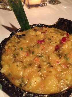 虽然是新开不久可是客人不少,藏珑系对于做云、泰菜还是很有口碑的。就在藏珑坊的二楼和三楼。环境很有泰国风情,大大的装饰花枝、孔雀毛、民族头饰、古旧的柜子、异域风情的绘画。原木地板、黄色砖墙、白桌布、红配黑的大吊灯,最喜欢的孔雀蓝的椅子,上面是五彩的靠垫。灯光较暗,桌上点着蜡烛,有种神秘的兰纳王国的气息。主打云南菜和泰北菜,价格适中,人均一百元左右。鸡枞菌什锦菜:爽爽脆脆的,酸辣中带着清香。版纳火烧肉:外皮带酥,肉嫩而多汁,蘸着酸辣的酱汁吃很有滋味而不油腻。汽锅鸡:汤清但味鲜带着点药香,里面还加了人参,很滋补。普洱茶句大虾:皮脆脆的,肉弹弹的,普洱酥非常鲜香。大救驾:很有意思的菜名,类似炒粉皮,软糯滑弹,咸、酸、辣都有了。饮料也很有特色,加了香芧的苹果汁带着异香。柠檬塔:细腻软滑,层次丰富,酸中带甜,非常开胃。总体感觉很好。