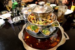 听说是最近很火的一家店啊。。(*^__^*) 嘻嘻,啊啦啊赶下潮流。。。。话说。。发了个微博。。。大家都知道是哪家。。。。。还都问老板帅不帅。。。汗汗汗。。。还是说说这个店把~四层火锅真心还是慢特别的说~蒸,煮,烤,串~一看到这个就眼前一亮。阿拉啊感受一下,,,欢迅。。。啊啦点了招牌的牛油麻辣锅。。哎哟妈呀。。。。这个真心好辣哦。。。我觉得和刘一手那个鸳鸯锅的辣的差不多了。。。。。不过豆制品个种。放在辣的里面比较好吃,这个到是真的。。。原来偶吃辣功底不够啊。。不过偶喜欢他们家烤的。。。。哈哈,,千层饼很好吃!!!!烤肉啊好吃。。。。还有鲶鱼。。。哈哈。。。我都爱。。。都是腌制过的,很入味的说。千层饼烤好很脆~烤肉会卷起一层皮~最上面以层很好玩的。。都是一个小小的锡纸小盆,放里面蒸。。。很Q啊。。可以蒸排骨,,小笼什么。。。哈哈。。都小小一个,,,,人多就要多蒸几次啦环境一般般吧~~服务还可以~可惜闹。个次么切到生蚝。。。哎哟。。重头戏,,么切到。。。失策哦失策哦~再推荐个麻辣三样菜。。。这个也推荐下下啦。。很入味。。虽然这个里面都小小滴。。。哪里公交车还是蛮多的,交通方便。。。。。查看更多
