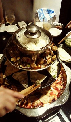 创意火锅第一次来吃呢。。四层火锅还是很新鲜的一种吃法,这回算是开眼界了第一次就是一般的火锅~第二层是烧烤,烤盘锅~第三次是干锅~最顶层是蒸锅~各有个的吃法~桌上还有韩国香蕉牛奶提供~每桌都有呢~想想这牛奶,超市里断货了呀。。哈哈~锅底我们点了招牌牛油麻辣锅~48米~就是最底下那个锅~没开火之前,锅子里就漂着一层辣油啊,看着就火辣辣的感觉呢~不习惯辣锅的它家还有其他锅,特色锅是麻辣锅,就点它了,有些朋友不习惯吃辣的,就放点水过滤一下辣油~话说把辣锅里的东西往水里一放,水上马上漂着一层冻结的油,看来果然用的是牛油,不错不错~农家油豆腐~12米~和一般家里吃的油豆腐口感不同呢,上来的油豆腐已经被剪开一半了,下锅煮一会就好了,很有嚼劲的说~不过很容易吸辣油哦~吃不来辣的朋友们可以弄盘水,稍微洗一下,哈哈~炸豆皮也不错哦~12米~是那种方方的小豆皮,下过一煮就能捞上来吃了,这个不是特别容易吸辣油~肉类点了肥牛羊组合~58米~中规中矩的~可以放底锅煮着吃,也能放烤盘上做烤肉吃~手工丸类组合~68米~推荐里面的牛肉丸哦~非常有嚼劲哦~不过就是要多煮上一会,不过熟不透啊~极力推荐烤千层酥饼呀~10米一盘~超级好吃,这个是放置第三层上烤的,服务员会过来帮着烤~烤的久一点的话,外皮会特别香脆。。而里面就酥酥的饼,真心好吃呢,推荐啊,如果人多可以来上2盘~二层我们点了辣炒鲜花蛤~28米~这个等于是干锅了,放在第二层~好吧~我想说好多空壳啊。。肉肉都掉锅底去了。。哈哈~想吃蛤蜊肉的直接用汤勺往锅底舀一勺就好了~味道还是很鲜美的,而且蛤蜊肉还蛮大额~饮料我们点了竹蔗马蹄水~22米一扎~好喝呀,特别是点辣锅的话,和这个很解辣哦~甜度比较适中,不会觉得特别的甜~如果烤盘脏了,可以让服务生过来帮忙清理一下~额,它家不能换烤盘呢~服务态度什么的都算勤快~PS~厕所在外面酒店里哦~稍稍有点不太方便的说~总体还是不错滴,朋友聚聚什么的~感觉冬天吃会更爽一点。。哈哈~查看更多