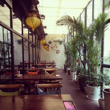 【位置】在江北九街,如果从观音桥过去的话,就是沿着北城天街,一直往上走,坚定不移一直走到BG,他家就在BG旁边,不过呢,他家在二楼,我们虽然看到招牌了,但是怎么上去还是个问题,最后发现是在中国银行门口有个电梯上去。。。【环境】虽然去之前看大家的评价都是说吃个环境气氛,不过去了发现其实店内环境是漂亮的但是可能期望太高,反而有点失望了,舞台也挺小的。不过他家有个阳光房,全是落地玻璃窗,加上各种绿色植物,木质的桌椅和美貌的吊灯,那片真我真喜欢~~不过,天气太热啦,晒着太热,最后还是选择坐大厅。【服务】服务员态度是不错的,可感觉有点心不在焉,客人的要求都不上心。【菜品】餐位费是1人5元,含茶水,茶水还不错哦,不像有些一杯白开水打发人,可以选择大麦茶,铁观音,普洱茶,味道还多浓的,值。但是餐位费不含米饭和餐纸,这个要单独收费的。菜品呢,可以说,所有菜品价格都比其他店高十几二十块,最便宜的一盘凉黄瓜,外面几块钱他家卖18,荤菜就更不用说了,随便一个就是50.60,还不是点的大菜哦,份量也不算多,好在味道还是不错的。蜜汁炭烧猪颈肉,下面是蜜豆打底,很甜,上面的猪颈肉是偏甜,不过味道倒也不错,一面烤得酥酥的,肥而不腻。蒜蓉粉丝蒸元贝,一盘6只,元贝个头还是大,洗的很干净,味道可以但是不算出彩,没必要点。超级推荐抹茶之恋金砖蜜糖吐司,68元一份,但是超级好吃啊,现烤的要等,不过很好吃,吐司切成小方块,烤得金黄金黄,吃着酥酥,并且抹茶冰激凌味道也不错,配着一冷一热,很喜欢!