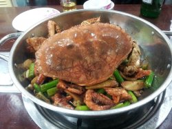 西坝河光熙门的蟹老宋就在马路边上,位置很好找,环境也不错,一进门就能闻到鲜美的螃蟹味。我们点了一份冰鲜花蟹,一份牛蛙、大虾,味道炒出来太鲜美了,连牛蛙都有蟹的味道。又配了鱼豆腐、腐竹、土豆片,蔬菜吸收了螃蟹的鲜汁味道也很鲜美。他家的酸梅汤一般,太甜了。查看更多