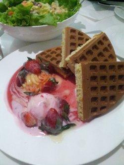 这家店开在虹口龙之梦里,算是开放式的餐厅,这里有主食不过大多来的都是冲着他们家的松饼,现在在搞活动开微信可以免费喝咖啡,开了微信点了他们家的草莓松饼,不得不说松饼装饰的非常可爱,而且松饼也是非常厚实的,但是吃起来相对没有什么脆度不过里面的吃起来还是很有蛋香气的配上水果口感还可以.查看更多